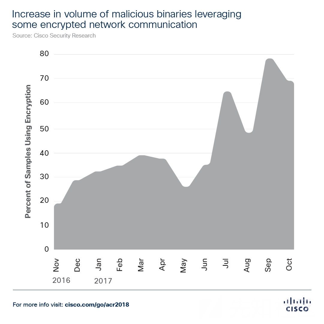 随着全球加密流量体量的增长,攻击者开始将加密作为隐藏C2活动的工具。思科研究人员发现在过去的12个月里,恶意软件样本使用加密网络通信的数量增加了3倍。对超过40万的恶意软件二进制文件进行分析发现,2017年10月有超过70%的比例使用了加密。