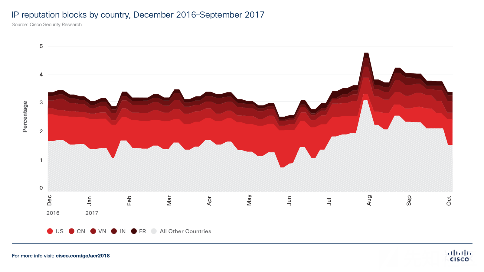 防护者可以看到的一个明显数据就是陡增的潜在恶意流量,同时增加的还有整体的恶意软件的量。恶意软件量的变化趋势对防护者的TTD(time to detection)有一定的影响。TTD是企业理解在来自恶意软件的持续攻击的压力下安全防护措施执行情况的重要度量。基于云的安全技术的使用是使思科TTD中位数在较低水平的关键因素。云可以在整体安全事件和攻击终端的恶意软件持续增长的情况下,帮助度量和维持性能。