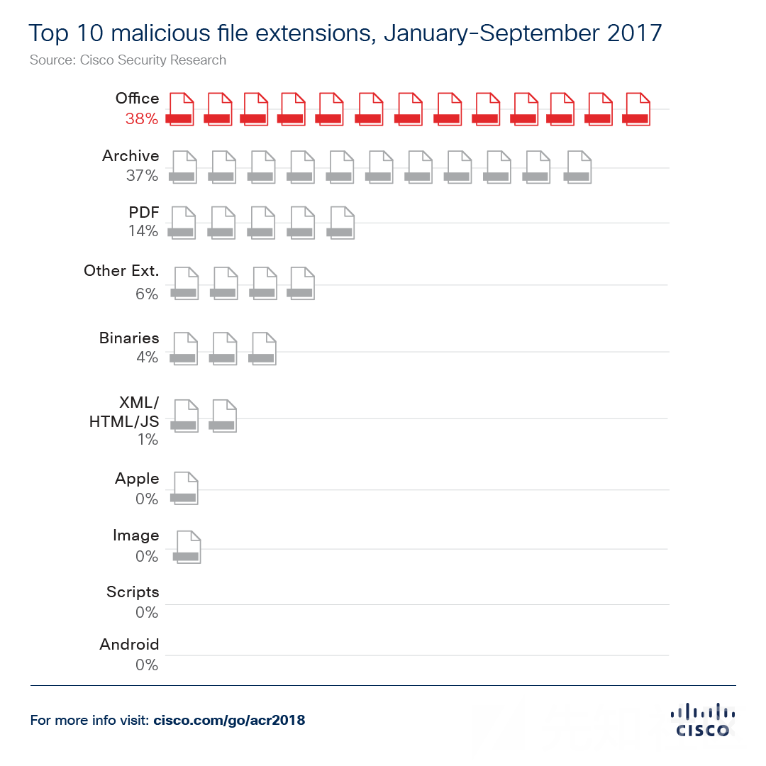 研究人员分析了2017年1月到9月的邮件记录,找出了恶意软件家族常用的恶意文件扩展类型。