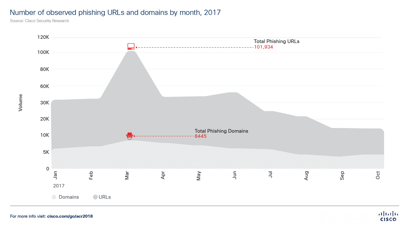 钓鱼和鱼叉式钓鱼攻击是窃取用户凭证和其他敏感信息的重要和有效的策略。事实上,钓鱼和鱼叉式钓鱼邮件是近年来重大数据泄露事件的根本原因之一。2017年的例子有针对Gmail用户和爱尔兰能源系统的攻击事件。研究人员分析了用户提交的可能的钓鱼邮件,下图是2017年1~10月钓鱼URL和钓鱼域名的数量。从中可以看出钓鱼URL和域名的流行性。