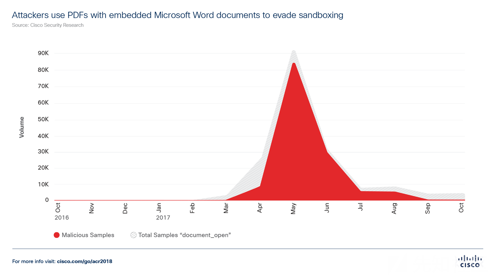 另外一种躲避沙箱检测的技术是伪装恶意payload存在的文件类型。如下图所示,2017年5月我们注意到许多嵌入Pdf文档的恶意word文件攻击类型。该文件沙箱绕过的方式可能是因为沙箱只打开和检测pdf文件,而不会打开和分析嵌入其中的word文件。Pdf文件中的内容会诱使用户点击和打开word文档,随之触发恶意行为。