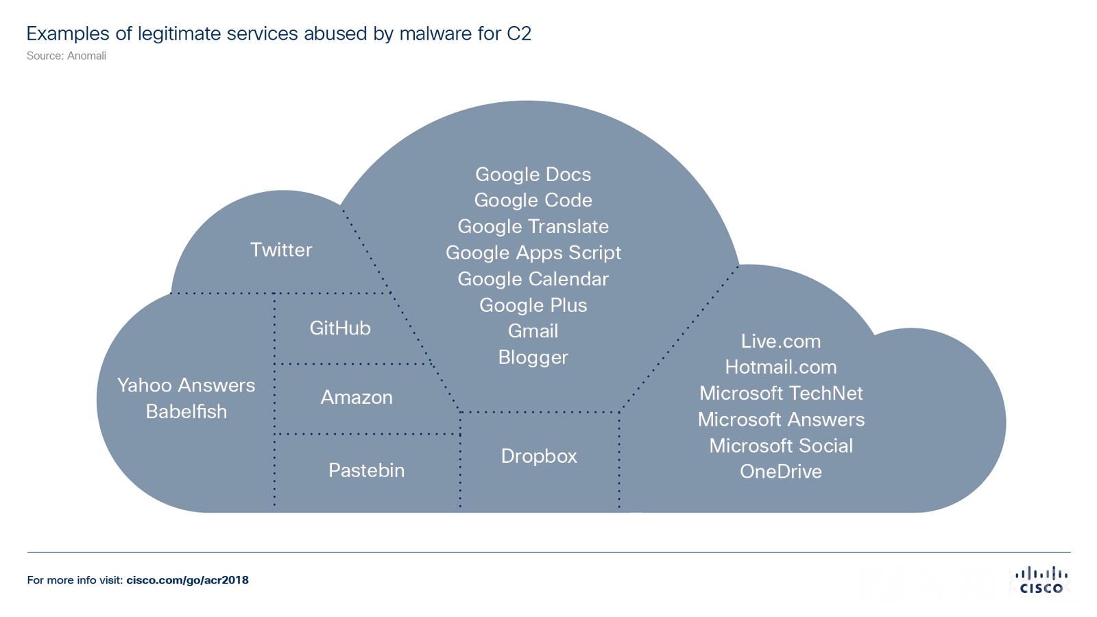 当攻击者用合法资源作C&C时,安全团队就很难检测到恶意网络流量,因为模仿了合法网络流量的行为。下图是思科与Anomali研究人员一起整理的过去几年被攻击者用作恶意后门C&C的合法服务的种类。