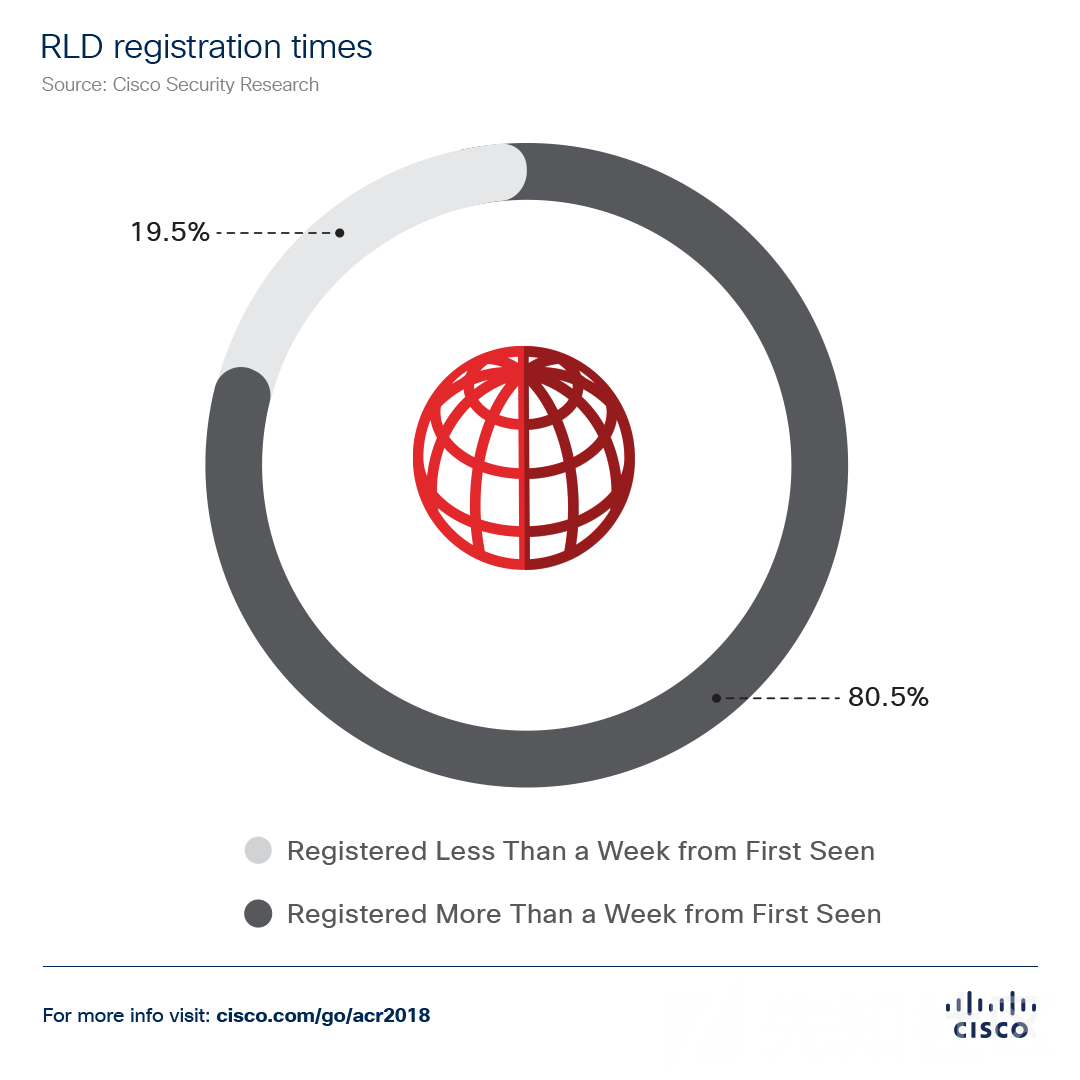 攻击者可能会在域名注册几天、几个月、几年后等待一个合适的时间去使用。研究人员发现大约只有20%的域名在注册后1周内就被使用了。