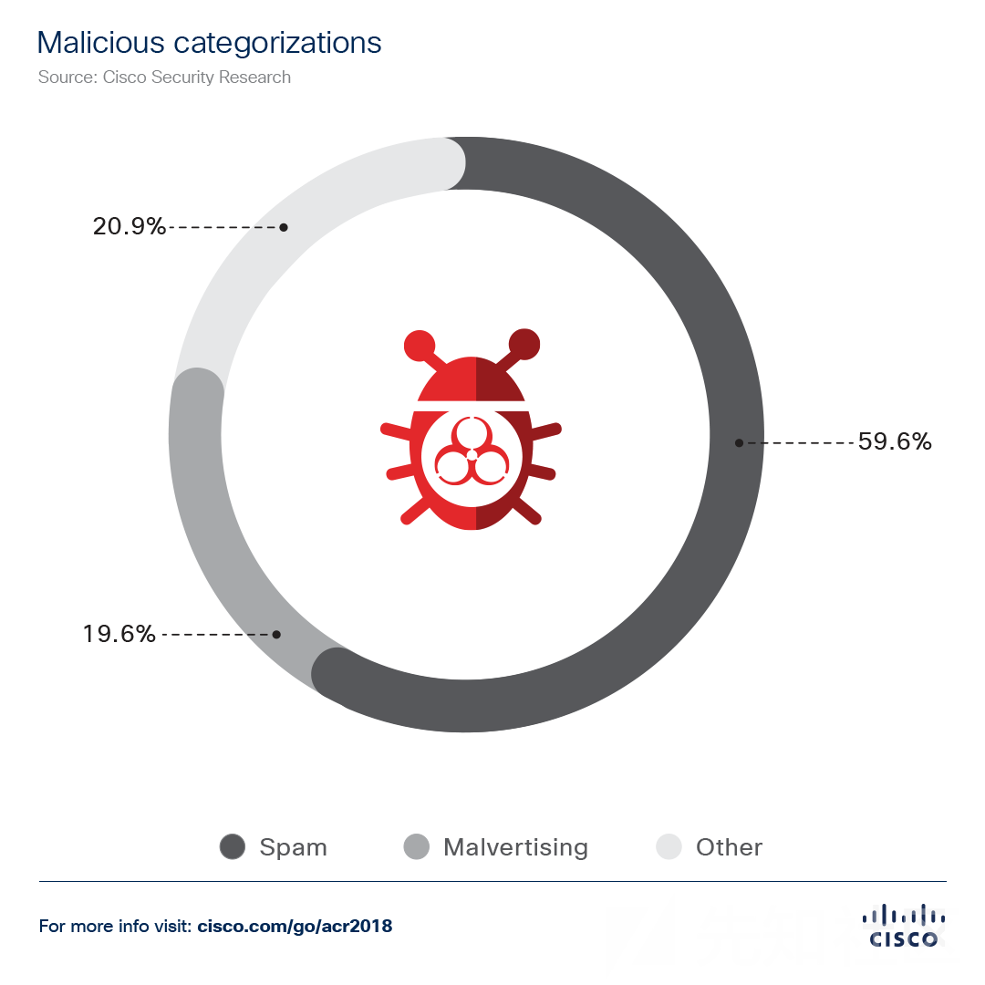 分析发现大约60%的恶意域名是与垃圾邮件活动相关的。大约1/5的域名是与恶意广告活动相关的。恶意广告已经成为将用户导向利用工具的必要攻击,比如分发勒索软件的利用工具。