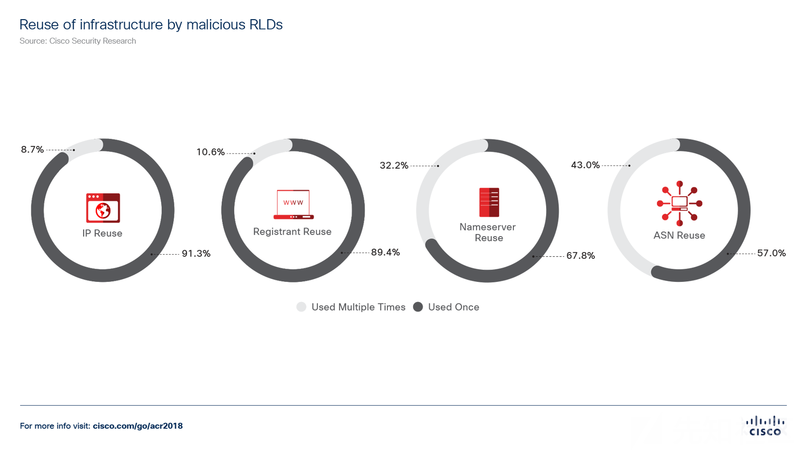样本中的恶意RLD会重用基础设施资源,比如注册者的邮箱地址、IP地址、ASN(autonomous system numbers)、和name server。比如,一个IP地址可以多个域名共用。所以攻击者可能会决定在IP和域名上进行投入,而不是选择服务器,因为服务器的成本更高一些。