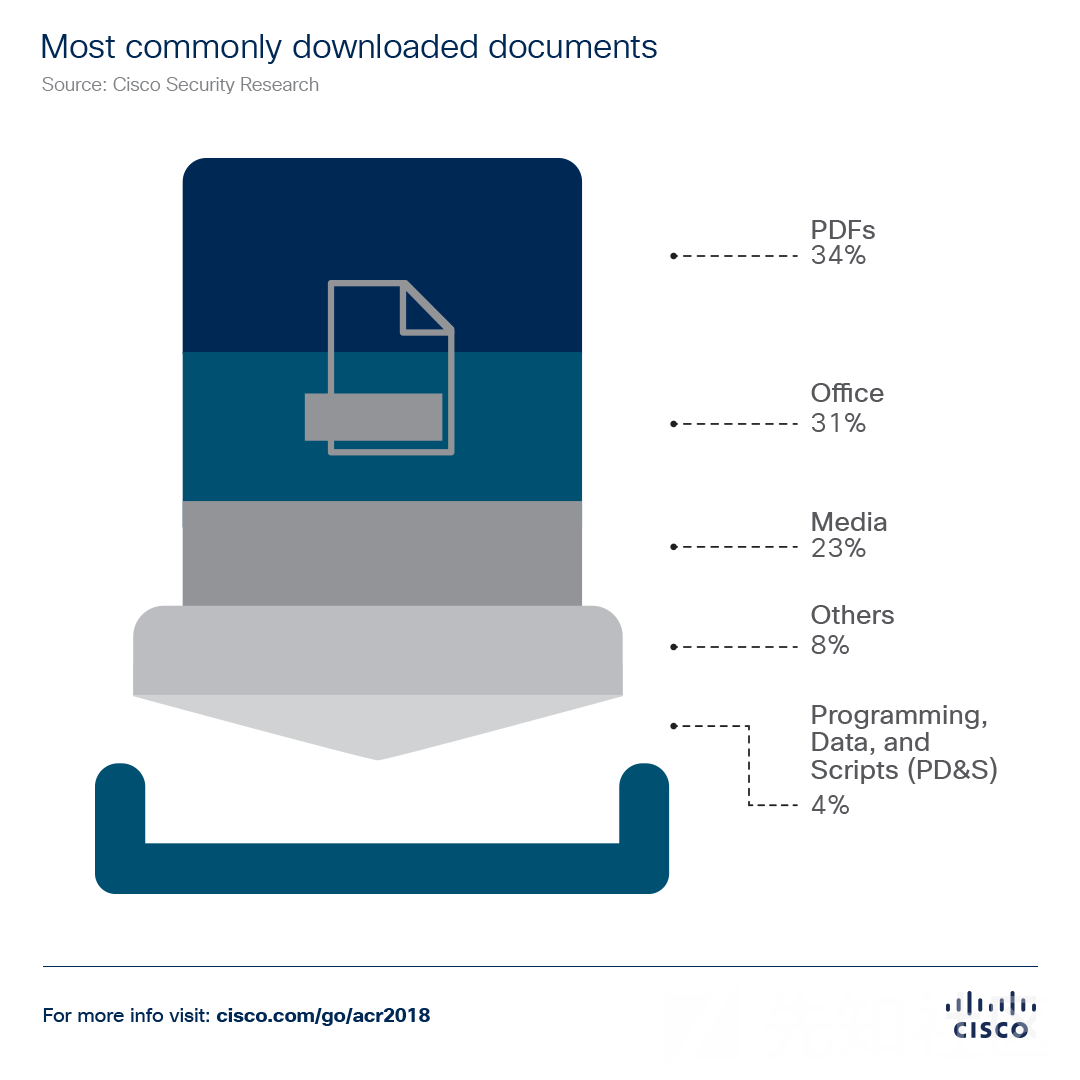 研究人员对这390万份可疑文档进行了基于文本的分析,发现关键词主要是数据,而文档类型中,34%是PDF文档,31%是office文档。