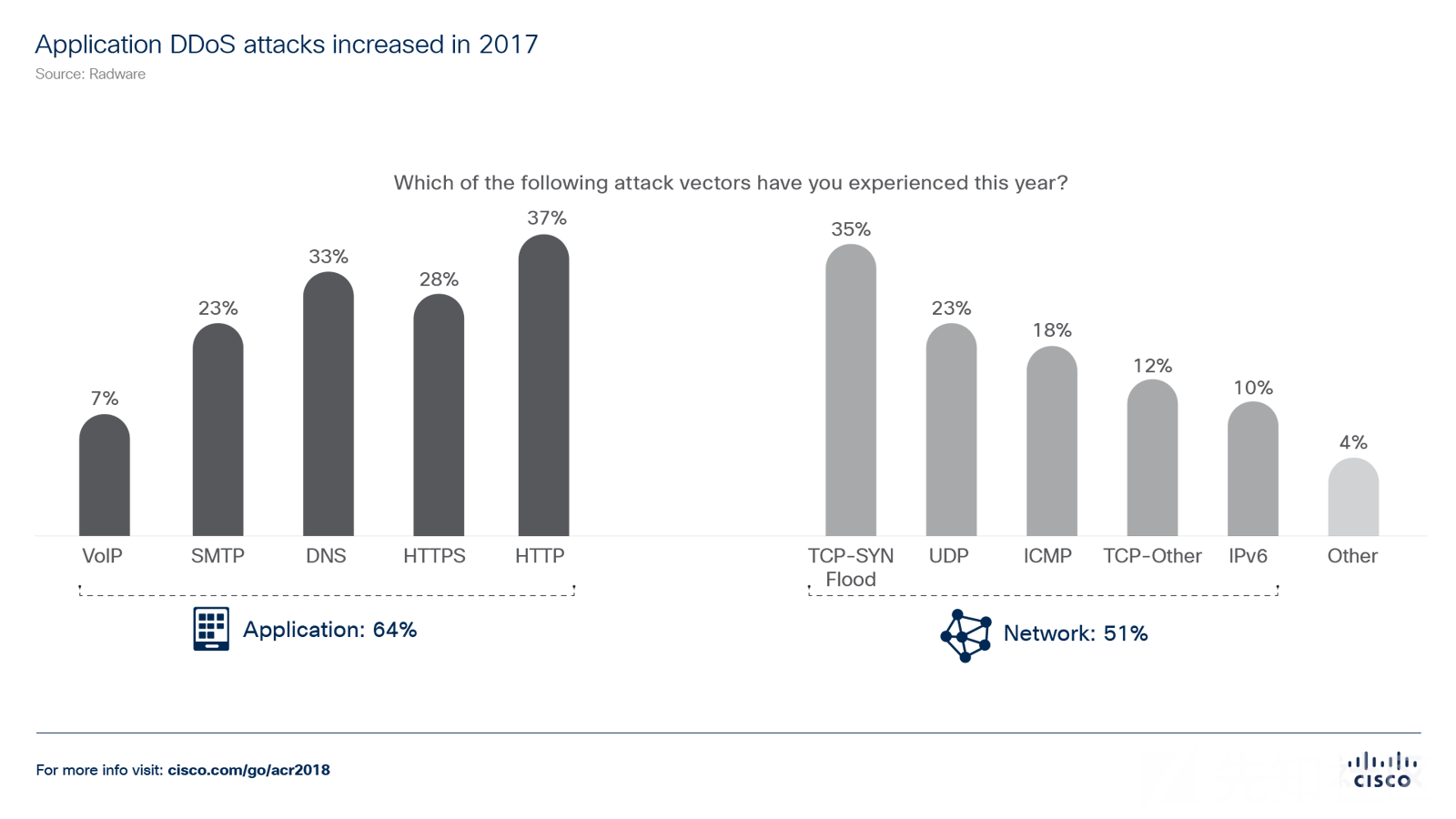 2017年DDOS攻击的另一个趋势是反射放大攻击。40%的受访者在2017年经历了反射放大攻击,其中1/3的企业无法应对此类攻击。