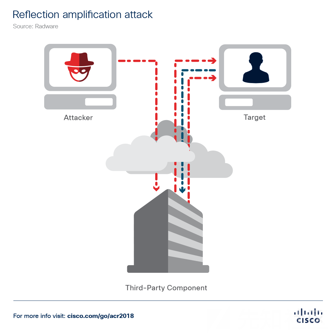 反射放大攻击中,攻击者用合法的第三方组件来发送攻击流量到攻击目标,借以隐藏攻击者的真实身份。攻击者首先将反射服务器的源IP地址设置为目标攻击用户的IP,随后将攻击包发送到反射服务器上。这会间接地用响应包淹没攻击目标,耗尽目标可利用的资源。