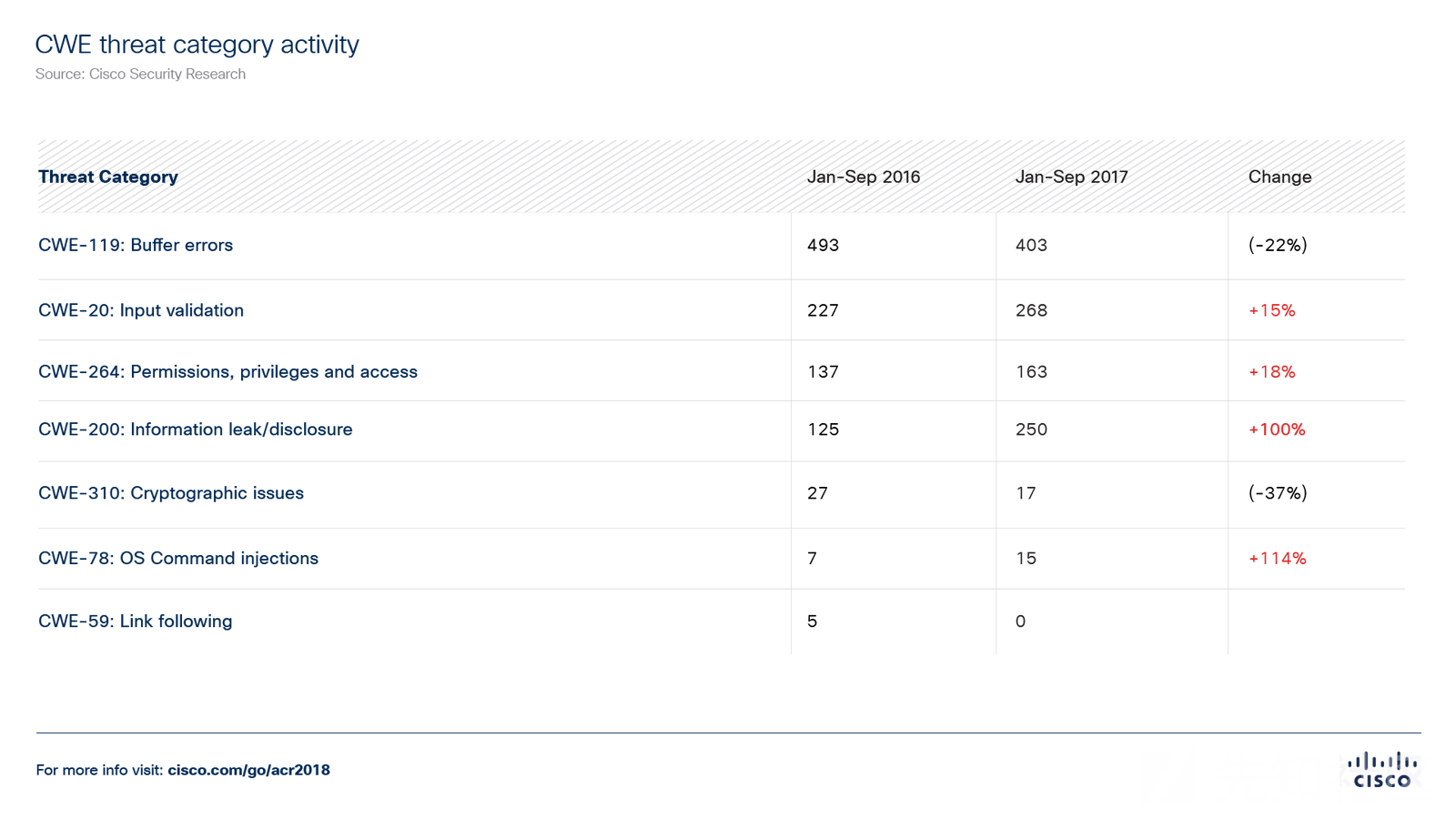 2017年,虽然缓冲区溢出错误漏洞有所减少,但仍是CWE漏洞中最多的,输入有效性漏洞也增加了。