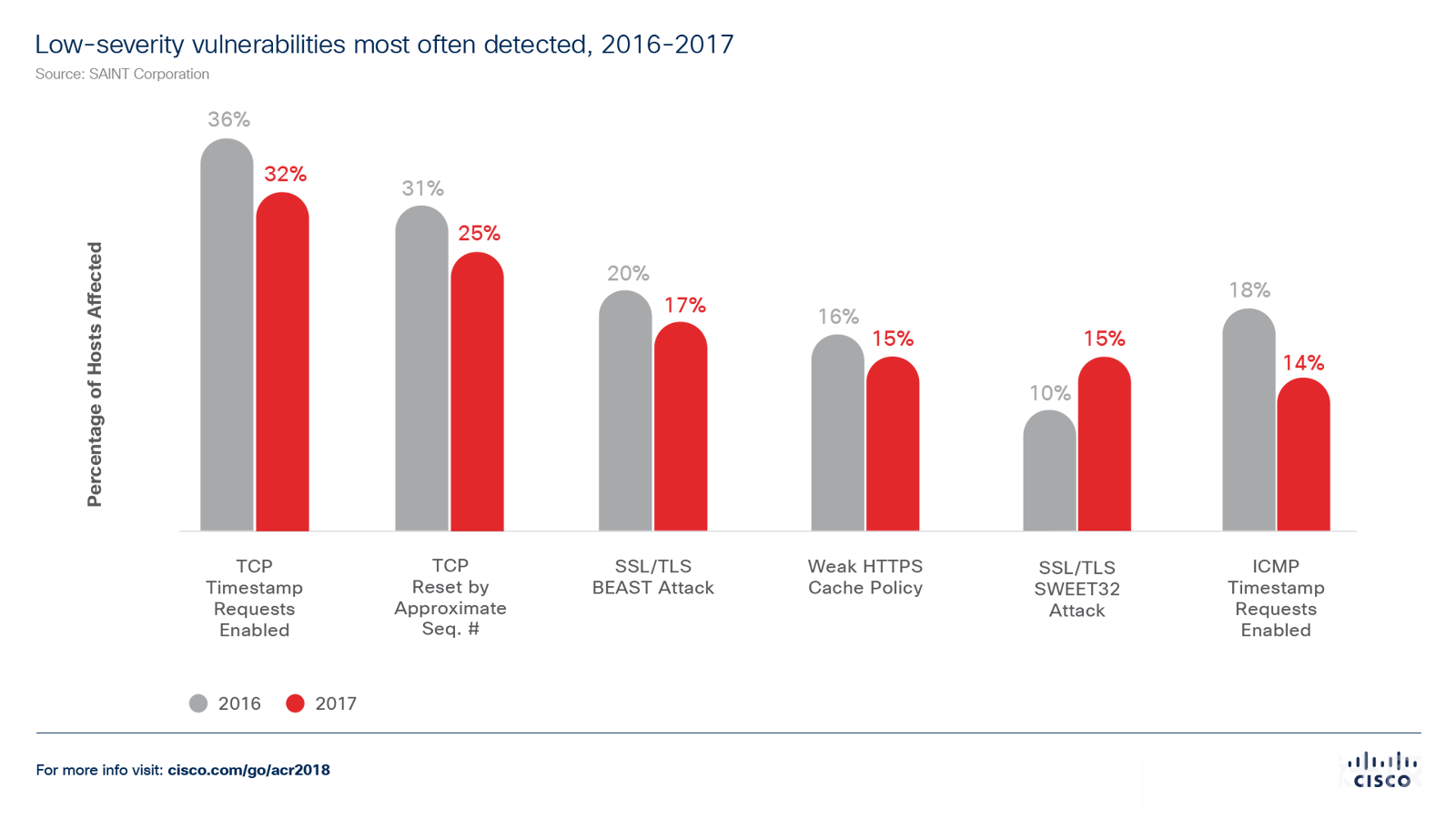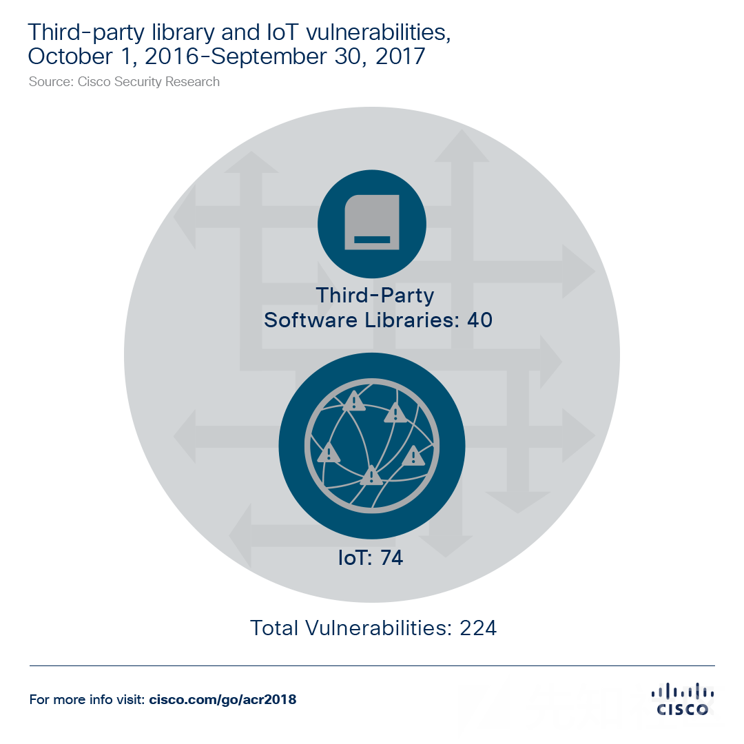 2016年10月到2017年9月间,研究人员在非思科的产品中一共发现224种新漏洞,其中40个是与第三方软件库有关的,74个与IOT设备相关。