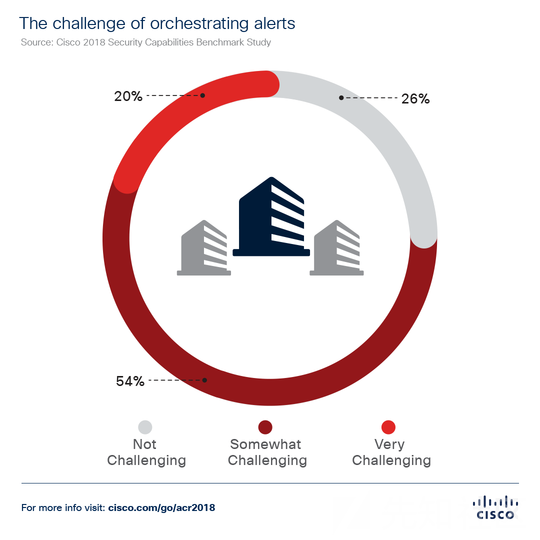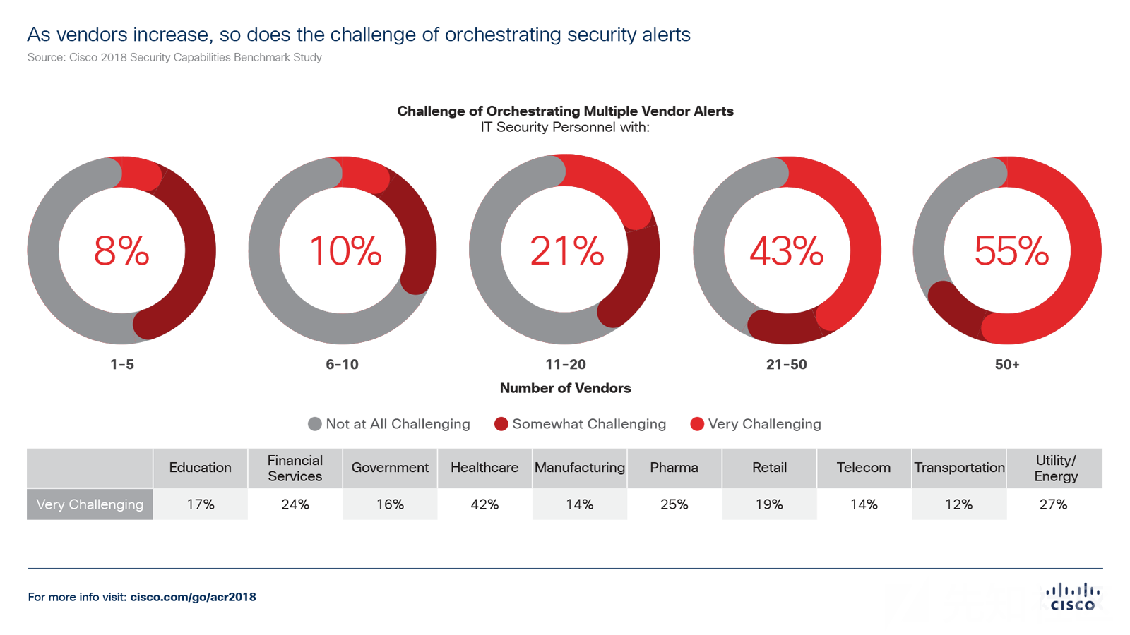 随着厂商数量的增多,也带来了一些挑战。54%的安全专家说处理这些产品的告警消息有时候是很有困难的,有20%的专家说非常有挑战性。