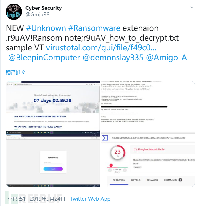 近日国外某独立恶意软件安全研究人员曝光了一个新型的勒索病毒,如下所示:
