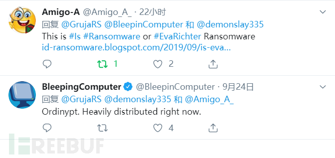 然后有人回复说是EvaRichter勒索病毒,并给出了id-ransomware博客地址,如下所示: