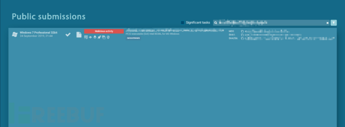 这款勒索病毒之所以勾起我的兴趣,主要是它与之前的GandCrab、Sodinokibi、GermanWiper、NEMTY等勒索有某些类似之处,都将桌面壁纸修改成蓝色了,笔者通过MD5在app.any.run上找到了相应的样本,如下: