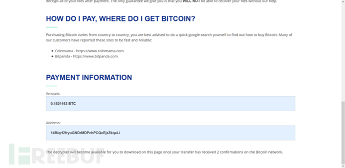 黑客的BTC钱包地址:14Biqrf2fryuGNDrMDPchPCQeEjzZkqaLi,勒索赎金七天之内为:0.1521163 BTC,如下所示: