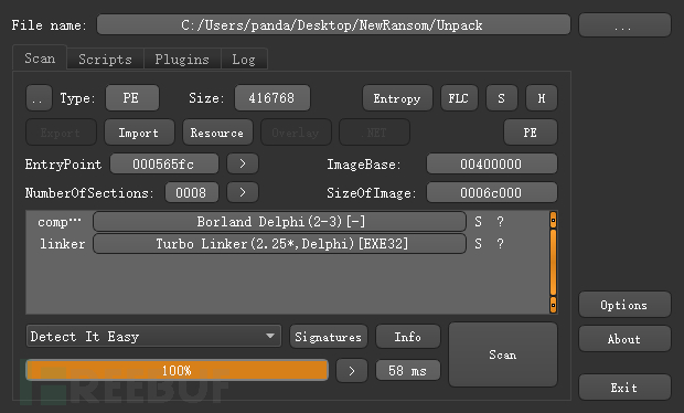 解密出完整的勒索病毒核心是一个PE文件,采用Delphi语言进行编写,如下所示: