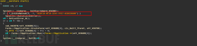 从勒索病毒的核心代码,我发现这款勒索病毒与之前我分析过的一款新型的勒索病毒GermanWiper创建的互斥变量一模一样,都是HSDFSD-HFSD-3241-91E7-ASDGSDGHH,GermanWiper勒索病毒的核心代码同样是使用Delphi语言编写的,于是我将两款勒索病毒的核心Payload代码进行对比,如下所示: