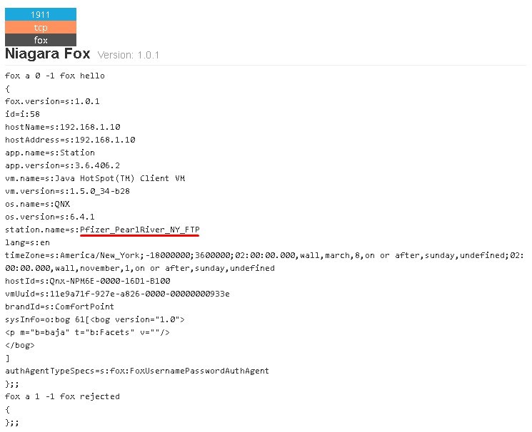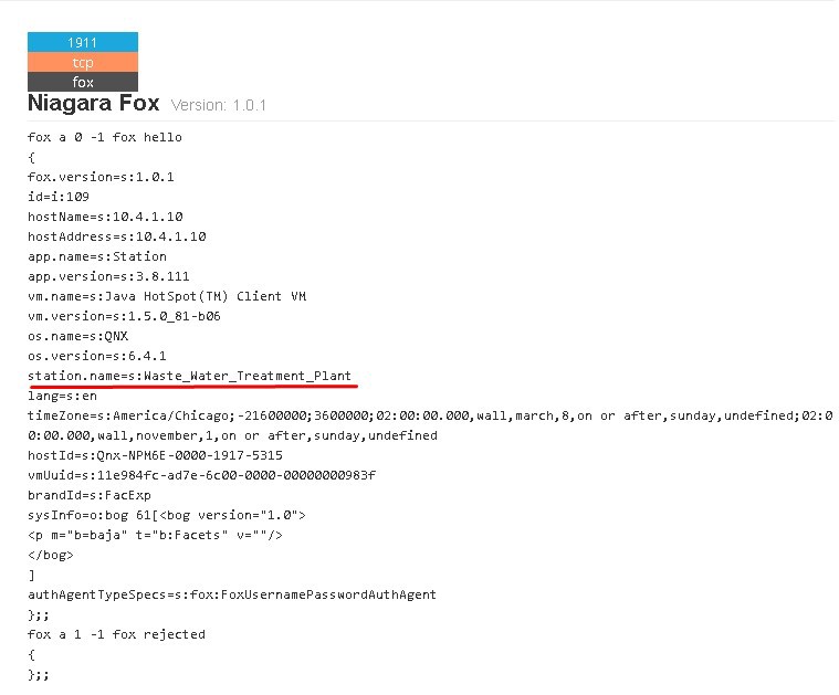 你已经知道哪些行业部门应该受到特别的保护,其中之一就是供水和废水系统部门。一旦供水中断,饮用水将无法供应,给企业和社会造成问题。在第一个案例中,Niagara Fox设备的“station.name”字段中暴露了某个供水和废水系统部门设施的名称。