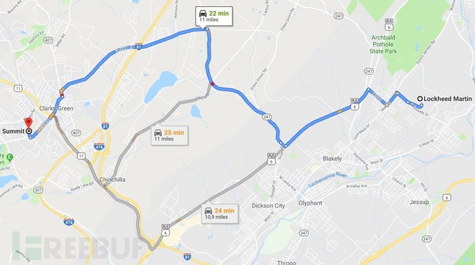 地理定位指向宾夕法尼亚州(Pennsylvania)的克拉克峰(ClarksSummit)。距离最近的洛克希德·马丁工厂(Lockheed Martin facility)也在11英里之外。