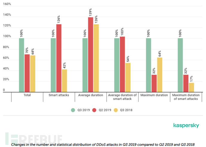 与2018年9月相比,2019年9月的攻击总数增加了35次,2019年第3季度的攻击总数与2018年第3季度相比上升了32次,虽然这些数字大致相同,但智能攻击数量指标的差异要大得多:智能攻击总数增长了58个百分点,但9月份的智能攻击数量仅增长了27个百分点,平均时长甚至下降了三个百分点。