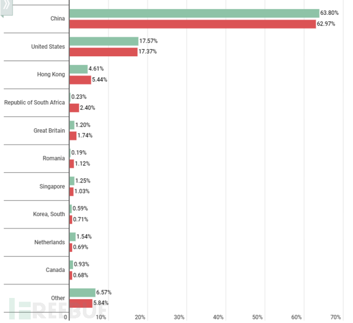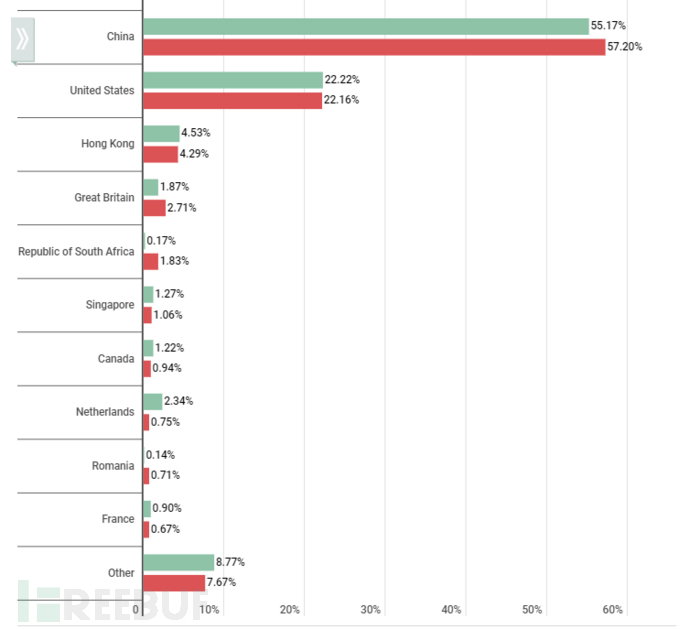 1、中国仍然是攻击次数最多的国家,与第二季度(62.97%对63.80%)相比,所占份额几乎没有变化。