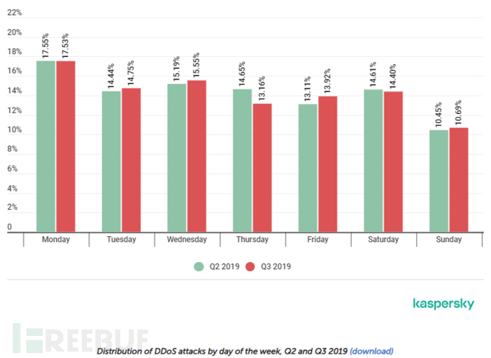 第三季度按天计算攻击次数分布与第二季度相似。最安全的一天是周日(10.69%的攻击)。DDoS攻击大部分发生在周一(17.53%)。