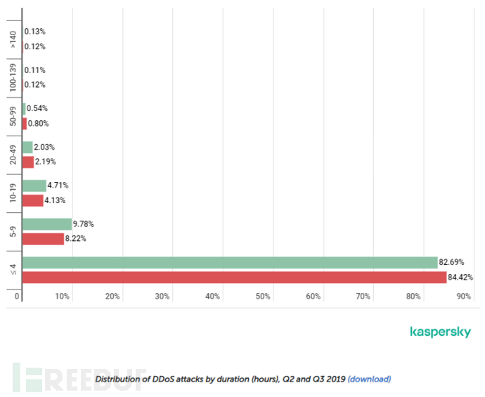 持续140多小时的攻击比例下降了0.01%至0.12%,20-139小时攻击的比例略有上升,5-9小时攻击的比例下降了1.5%,短攻击(持续时间不超过4小时)的总比例上升到84.42%。