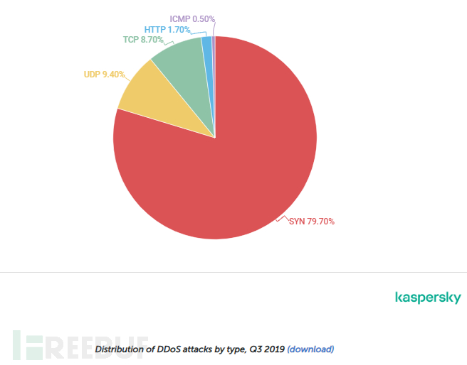 主要攻击类型仍然是SYN泛洪,从84%降至79.7%。排名第二的是UDP攻击(9.4%)。
