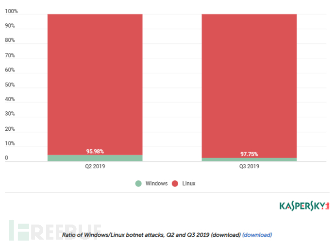 Linux僵尸网络的份额继续增长:第三季度的为97.75%,Windows僵尸网络下降了1.75个百分点,至2.25%。