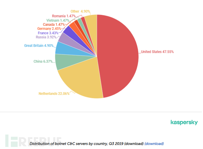 美国的C&C服务器数量位居榜首,其份额从44.14%增至47.55%,第二位的是荷兰,俄罗斯以3.92%升至第五位。