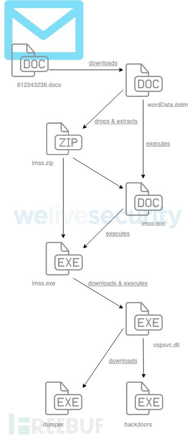 下图显示的攻击者一步一步实现成功入侵的过程,即从一开始目标用户在收件箱中收到恶意电子邮件,到最终在目标用户的设备上部署后门: