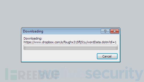 研究人员发现,钓鱼邮件中携带的附件文档其实是一份空白文档,但这个恶意文档引用了一个托管在Dropbox上的远程模板:wordData.dotm。使用Word打开这个文档之后,它将会下载wordData.dotm,并将其合并到相关文档的工作环境中,其中还包括模板中隐藏的内容,具体情况如下图所示: