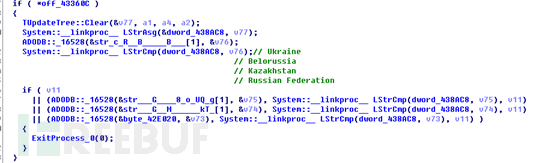 当不带参数启动之后会获取当前系统国家是否为Ukraine、Belorussia、Kazakhstan或者Russian Federation,如果是其中一个则直接退出进程: