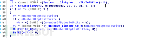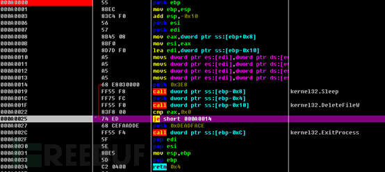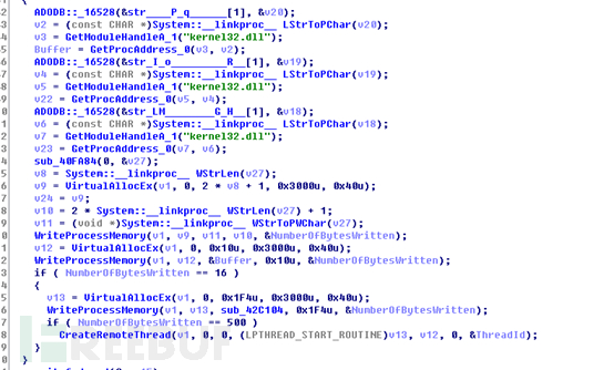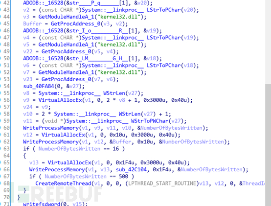 随后会检查Offset_373C地址的值如果不为空,并检查参数中是否带有“-start”,如果条件都不成立则会创建一个进程,通过创建远程线程执行写入的一段ShellCode来删除文件: