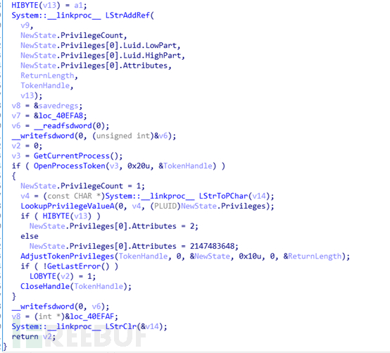 随后会对该进程进行提权,提到SeDebugPrivilege权限: