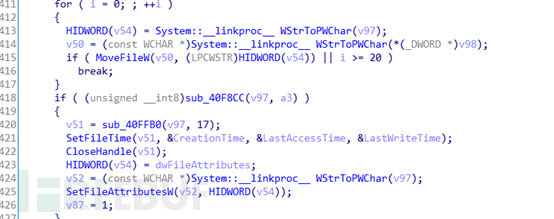 随后会在当前路径下释放一个后缀为.zeppelin的文件并写入1个字节,内容为0×00的数据,然后调用DeleteFileW删除该文件,如果删除失败则调用ExitProcess退出进程,此举应该是测试当前进程是否能够读写删除文件,以便判断后续是否能够加密文件: