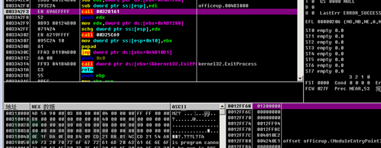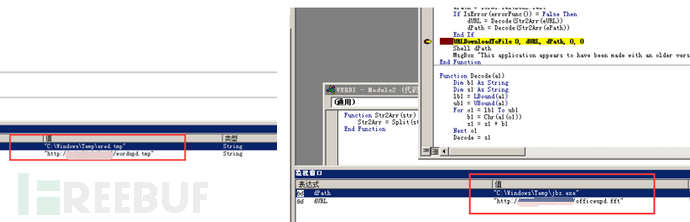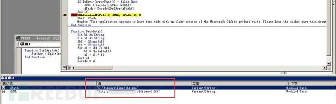 通过调试,宏代码解密窗体中的数据,然后从远程服务器hxxp://192.xxx.210.xxx/officeupd.fft下载恶意程序到C:\Windows\Temp\jbz.exe,然后执行恶意程序,如下所示: