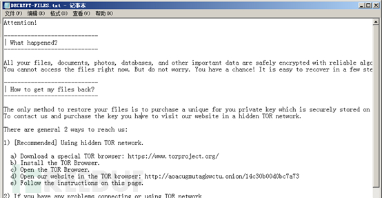 勒索提示信息文件DECRYPT-FILES.txt,内容如下所示: