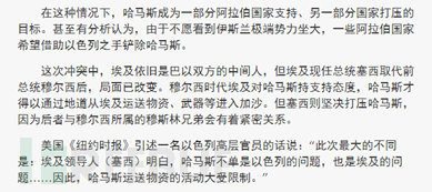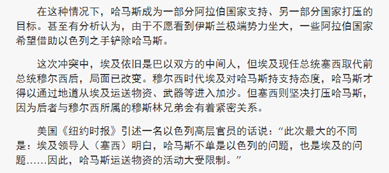 态度转变的埃及政府:埃及前总统穆尔西曾是***,兄弟会组织成员,而哈马斯也与***,兄弟会有密切联系,因此哈马斯得到一部分***国家支持,但因为该组织模糊了抵抗运动和恐怖组织之间的界限,很多人对该组织也呈反对态度。前总统穆尔西在位期间埃及对哈马斯武装力量提供了大量的资源和支持,利用埃及的地中海口岸和地道该武装力量得以从外界购买大量武器装备进入加沙地区。