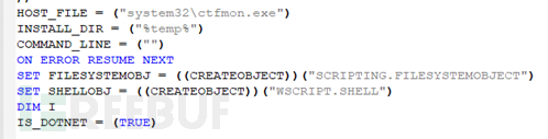 与其他脚本相比,该脚本十分庞大,并且执行流程更为复杂,经过多次循环解密后得到其最终后门脚本。最终程序将会设置注入的系统进程ctfmon.exe、释放路径(%temp%)、执行程序(Wscript)等。
