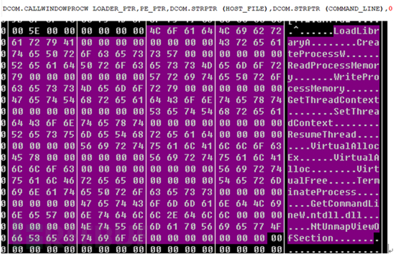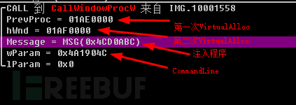 脚本两次调用VirtualAlloc函数shellcode写入内存,并在内存中声明CreatePorcessW、SetThreadContext等函数用作进程注入,最后调用CallWindowProcW函数跳转到第一个参数的Shellcode处继续执行程序: