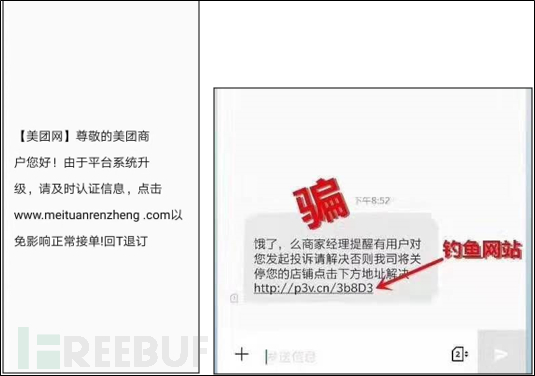 11月6日当天,有大量用户收到自称是饿了么、美团的短信,要求用户点击短信链接,进行相关进一步操作。