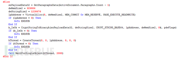 使用宏代码,在office中直接解密shellcode,在内存中创建线程执行: