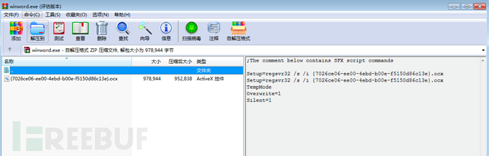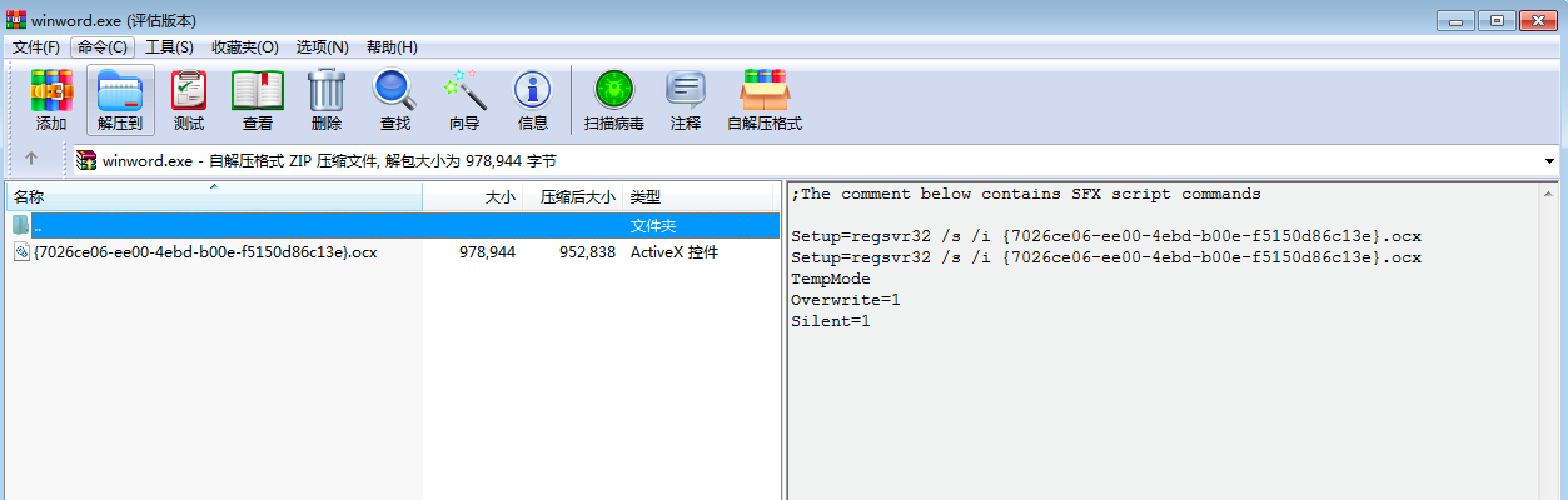 该文件为一个自解压程序,等启动后,会释放一个{7026ce06-ee00-4ebd-b00e-f5150d86c13e}.ocx文件,然后执行命令regsv*** /s /i {7026ce06-ee00-4ebd-b00e-f5150d86c13e}.ocx执行: