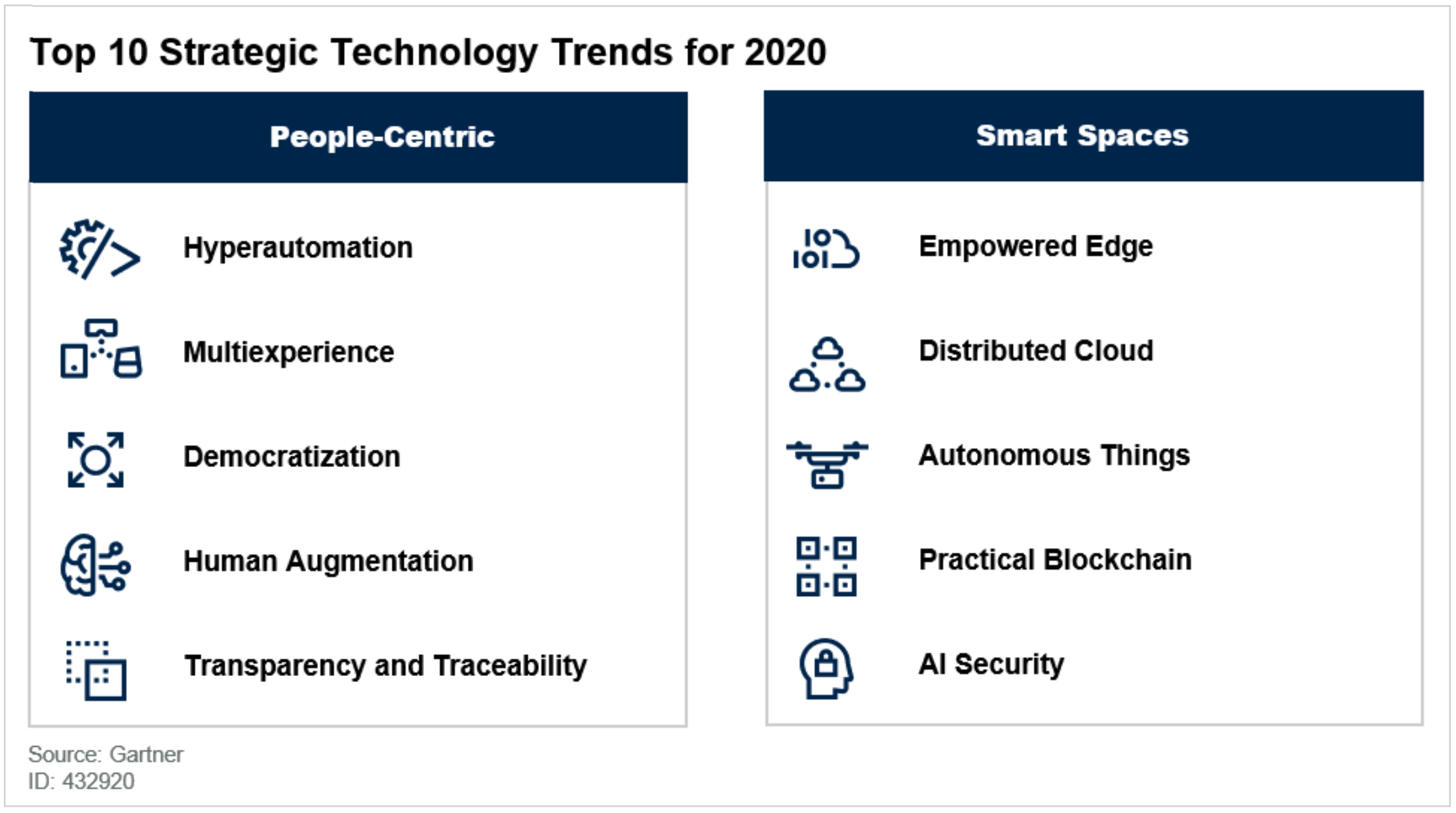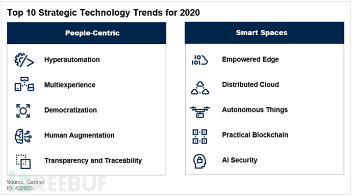 2020年十大战略技术趋势分为以人为中心和智能空间两个类别。这是一个宽泛的划分,旨在传达趋势的主要影响和表现。然而,几乎所有的趋势都将对人和智能空间的概念产生影响。