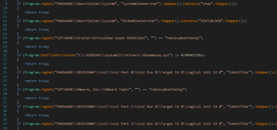 通过对相关注册表和文件的判断来检测是否运行在虚拟机中: